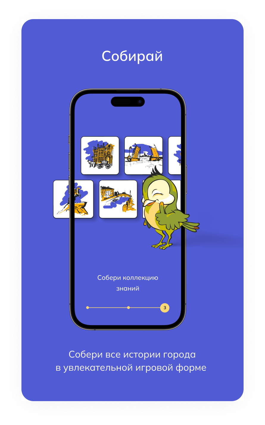Забавная и озорная птичка станет вашим проводником в историю города, рассказывая вам увлекательные истории, стихи и песни, загадки и факты о городе.
